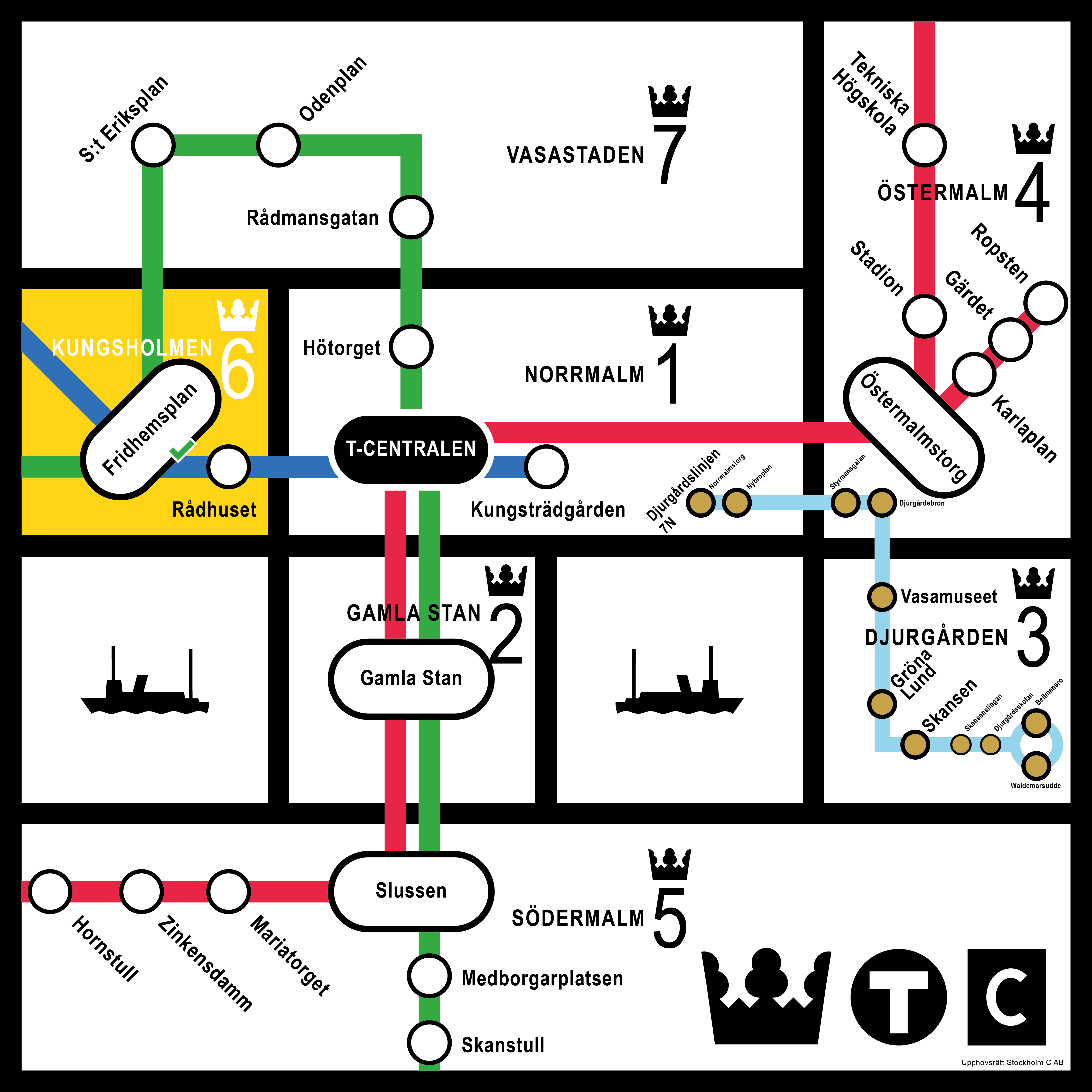 Dessa tankar inspirerade oss att skapa en lösning: en karta över tunnelbanesystemet i Stockholms innerstad. Under vår VD:s raster, på ett café, ritade Francisco den första skissen på en servett. Med sin erfarenhet som taxiförare kunde han förenkla det komplexa tunnelbanelandskapet – från 100 till 19 stationer – så att både lokalbor och turister snabbt ska förstå hur de smidigast tar sig fram och byter mellan stationer och stadsdelar. Vi kallar den för T-banekartan.